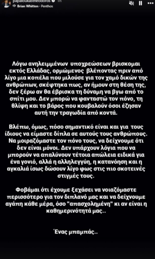 «Λόγω ανειλημμένων υποχρεώσεων βρίσκομαι εκτός Ελλάδας. Βλέποντας πριν από λίγο μια κοπέλα που μιλούσε για τον χαμό δικών της ανθρώπων, σκέφτηκα πως, αν ήμουν στη θέση της, δεν ξέρω αν θα έβρισκα τη δύναμη να βγω από το σπίτι μου. Δεν μπορώ να φανταστώ τον πόνο, τη θλίψη και το βάρος που κουβαλούν όσοι έζησαν αυτή την τραγωδία από κοντά.