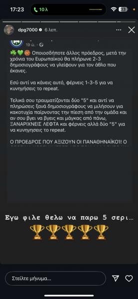 Ο ισχυρός άνδρας της “πράσινης” ΚΑΕ με ανάρτηση του στο instagram εξέφρασε την επιθυμία του για 5 σερί τρόπαια με τον Παναθηναϊκό, δείχνοντας αποφασισμένος να δημιουργήσει μια απόλυτη αυτοκρατορία του “τριφυλλιού” στην Ευρώπη!