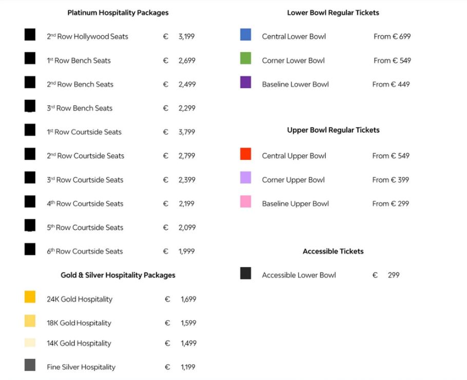 Όσον αφορά τις τιμές, αυτές ξεκινούν από τα 74.75 ευρώ ανά παιχνίδι (299 ευρώ σύνολο για τέσσερα παιχνίδια – δηλαδή δυο ημιτελικούς, μικρό και μεγάλο τελικό) και φτάνουν μέχρι τα 187.25 ευρώ ανά παιχνίδι (749 σύνολο για τέσσερα ματς).