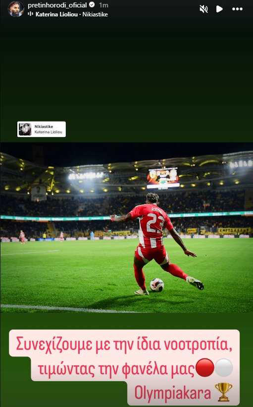 «Συνεχίζουμε με την ίδια νοοτροπία, τιμώντας τη φανέλα μας. Ολυμπιακάρα», ανέφερε στο story που έκανε στο Instagram ο Βραζιλιάνος.