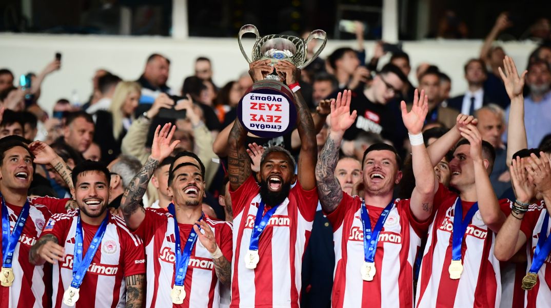 Ο ιδιοκτήτης του Ολυμπιακού, Βαγγέλης Μαρινάκης, και οι Παναγιώτης Ρέτσος και Αγιούμπ Ελ Κααμπί σήκωσαν μαζί την κούπα στον ουρανό του ΟΑΚΑ. Ολυμπιακός