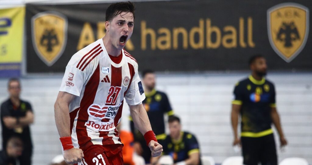 Με το… δεξί μπήκε ο -κάτοχος του τίτλου- Ολυμπιακός/Όμιλος Ξυνή στη σειρά των τελικών της Α1 χάντμπολ των ανδρών. Η ομάδα του Ρικάρντο Τριλίνι επιβλήθηκε 32-27 της ΑΕΚ στην αίθουσα «Γ. Κασσιμάτης» του ΟΑΚΑ, στον πρώτο τελικό της Handball Premier, και έκανε το πρώτο βήμα (από τα τρία που απαιτούνται) για την κατάκτηση του τίτλου.