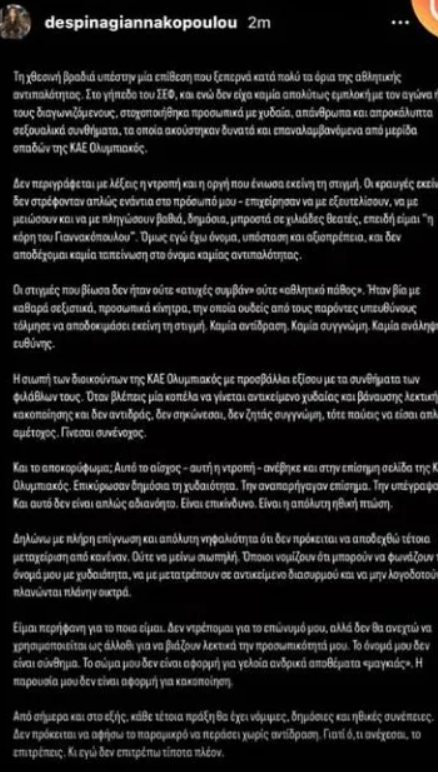 «Τη χθεσινή βραδιά υπέστην μία επίθεση που ξεπερνά κατά πολύ τα όρια της αθλητικής αντιπαλότητας. Στο γήπεδο του ΣΕΦ, και ενώ δεν είχα καμία απολύτως εμπλοκή με τον αγώνα ή τους διαγωνιζόμενους, στοχοποιήθηκα προσωπικά με χυδαία, απάνθρωπα και απροκάλυπτα σεξουαλικά συνθήματα, τα οποία ακούστηκαν δυνατά και επαναλαμβανόμενα από μερίδα οπαδών της ΚΑΕ Ολυμπιακός.