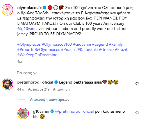 Ο θρυλικός Τζιοβάνι επέστρεψε στο «Γ. Καραϊσκάκης» και συγκίνησε τους φίλους του Ολυμπιακού, φορώντας την επετειακή φανέλα των 100 χρόνων του συλλόγου. Ο Βραζιλιάνος παλαίμαχος, που λατρεύτηκε όσο λίγοι στον Πειραιά, επισκέφθηκε και τα αποδυτήρια της ομάδας, με τον Ολυμπιακό να δημοσιεύει σχετικά στιγμιότυπα στα social media.