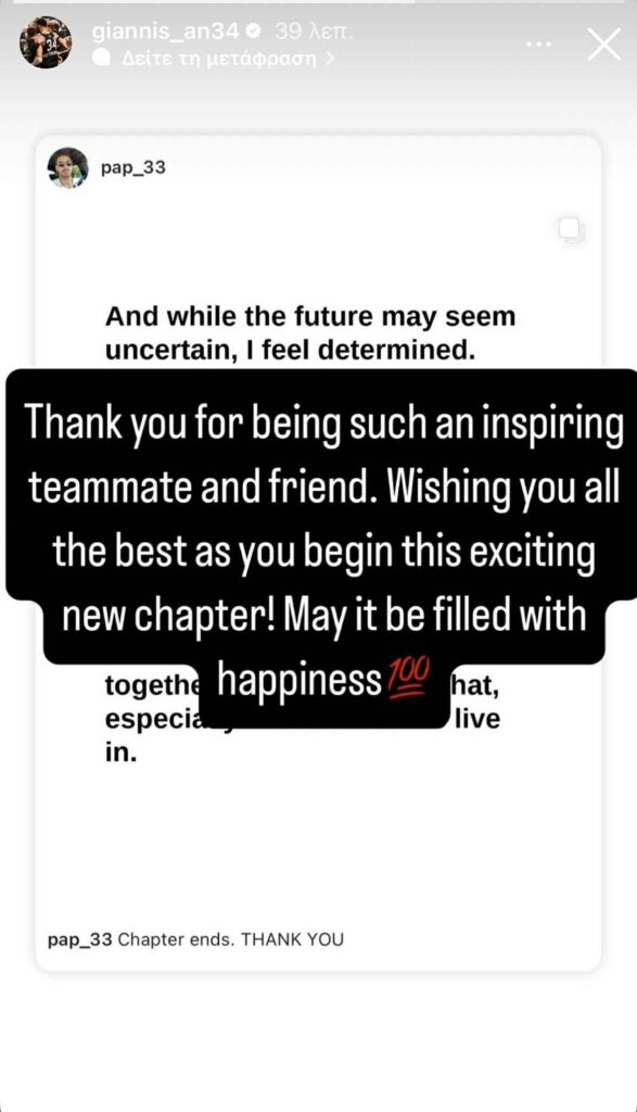 «Σε ευχαριστώ που ήσουν ένας συμπαίκτης και ένας φίλος που μου έδωσε έμπνευση. Σου εύχομαι τα καλύτερα καθώς ξεκινάς αυτό το συναρπαστικό νέο κεφάλαιο. Μακάρι να είναι γεμάτο με ευτυχία», έγραψε ο Greek Freak για τον πρώην πλέον παίκτη του Ηλυσιακού, του Ολυμπιακού, του Παναθηναϊκού και της Παρτίζαν.