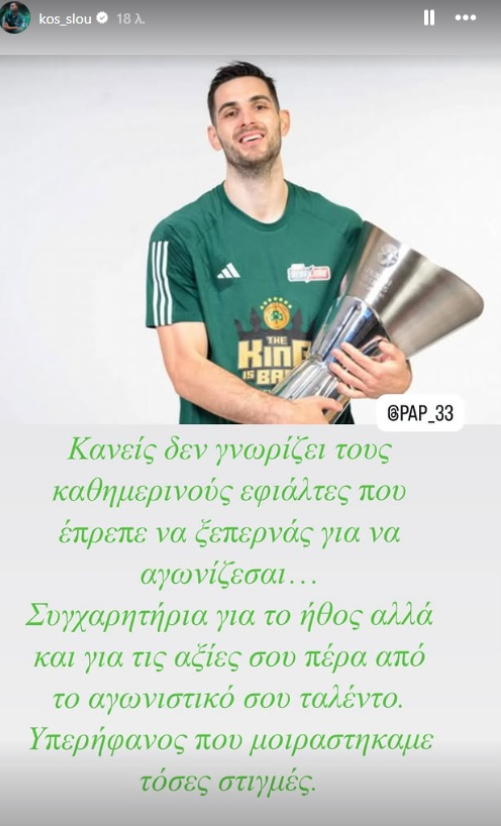 «Κανείς δεν γνωρίζει τους καθημερινούς εφιάλτες που έπρεπε να ξεπερνάς για να αγωνίζεσαι. Συγχαρητήρια για το ήθος αλλά και για τις αξίες σου πέρα από το αγωνιστικό σου ταλέντο. Υπερήφανος που μοιραστήκαμε τόσες στιγμές».