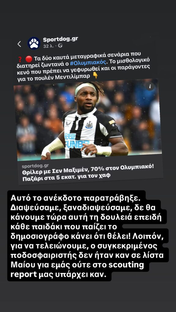 Μέσω ανάρτησής του στο Instagram, ο Καραπαπάς χαρακτήρισε «ανέκδοτο» τη φημολογία γύρω από τον Σεν-Μαξιμέν, σημειώνοντας πως η ομάδα έχει διαψεύσει επανειλημμένα τις σχετικές φήμες. Παράλληλα, εξέφρασε την ενόχλησή του για την παραπληροφόρηση που προέρχεται – όπως ανέφερε – από μη αξιόπιστες πηγές.