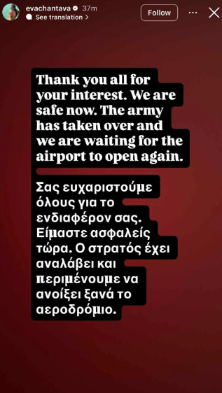 «Σας ευχαριστούμε όλους για το ενδιαφέρον σας. Είμαστε ασφαλείς τώρα. Ο στρατός έχει αναλάβει και περιμένουμε να ανοίξει ξανά το αεροδρόμιο», έγραψε στην ανάρτηση της στο Instagram.