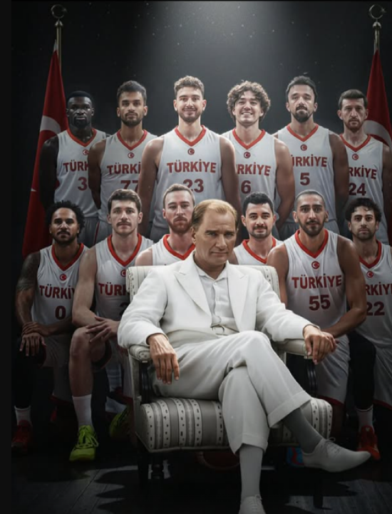Αρχικά, ο άσος των Χιούστον Ρόκετς ανάρτησε μια AI φωτογραφία που δείχνει τον Κεμάλ σε μια καρέκλα και πίσω του όλους τους παίκτες της εθνικής ομάδας μπάσκετ της Τουρκίας.
