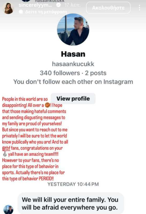 «Οι άνθρωποι σε αυτόν τον κόσμο είναι τόσο απογοητευτικοί! Όλο αυτό για το μπάσκετ. Ελπίζω όσοι κάνουν σχόλια μίσους και στέλνουν αηδιαστικά μηνύματα στην οικογένειά μου να είναι περήφανοι για τον εαυτό τους! Αλλά επειδή θέλετε να επικοινωνήσετε μαζί μου ιδιωτικά, θα φροντίσω να ενημερώσω τον κόσμο δημόσια για το ποιοι είστε! Και σε όλους τους οπαδούς της Τουρκίας, συγχαρητήρια για το ασημένιο μετάλλιο σας, έχετε μια καταπληκτική ομάδα! Ωστόσο, δεν υπάρχει χώρος για τέτοιου είδους συμπεριφορά στον αθλητισμό. Στην πραγματικότητα, δεν υπάρχει χώρος για τέτοιου είδους συμπεριφορά ΤΕΛΟΣ!».