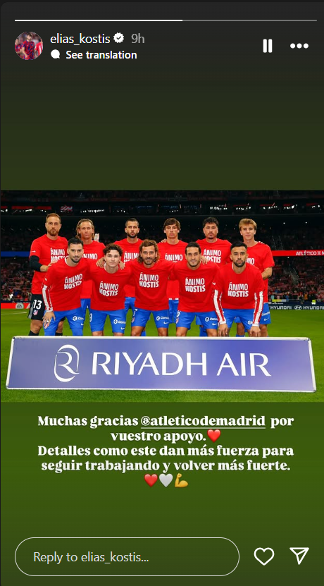 Οι παίκτες της Ατλέτικο Μαδρίτης φόρεσαν μπλουζάκια υποστήριξης προς τον 22χρονο Ηλία Κωστή, ο οποίος υπέστη ρήξη χιαστού.