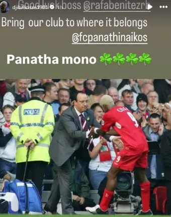 Ο παλαίμαχος Γάλλος άσος, ανέβασε ένα story στο Instagram μία κοινή φωτογραφία του με τον Ράφα Μπενίτεθ απ’ τις… μέρες τους στο Λίβερπουλ κι έγραψε: «Καλή τύχη κόουτς Ράφα Μπενίτεθ. Φέρε την ομάδα μας εκεί που αξίζει. Πανάθα μόνο!».