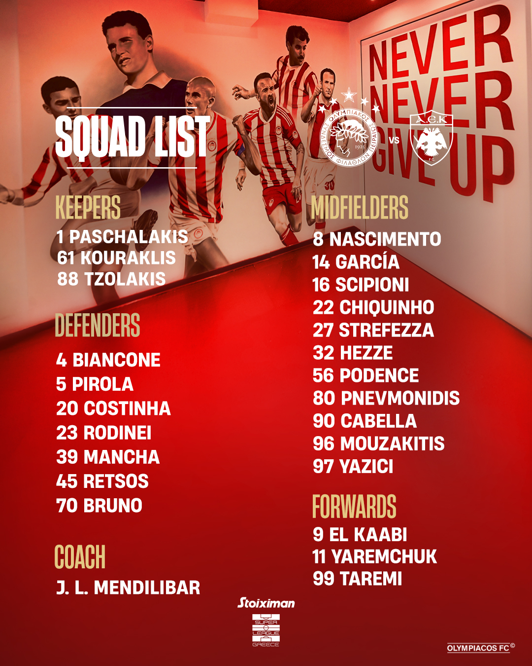 Αναλυτικά η αποστολή του Ολυμπιακού: Πασχαλάκης, Κουράκλης, Τζολάκης, Μπιανκόν, Πιρόλα, Κοστίνια, Ροντινέι, Μάντσα, Ρέτσος, Μπρούνο, Νασιμέντι, Γκαρσία, Σκιπιόνι, Τσικίνιο, Στρεφέτσα,Έζε, Πνευμονίδης, Ποντένσε,Καμπελά, ΓιαζίτσιΜουζακίτης, Ελ Κααμπί, Γιάρεμτσουκ και Ταρέμι