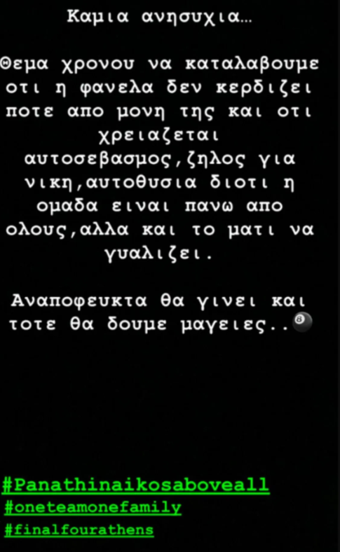 “Καμία ανησυχία… Θέμα χρόνου να καταλάβουμε ότι η φανέλα δεν κερδίζει ποτέ από μόνη της και ότι χρειάζεται αυτοσεβασμός, ζήλος για νίκη, αυτοθυσία διότι η ομάδα είναι πάνω απ’ όλους, αλλά και το μάτι να γυαλίζει.