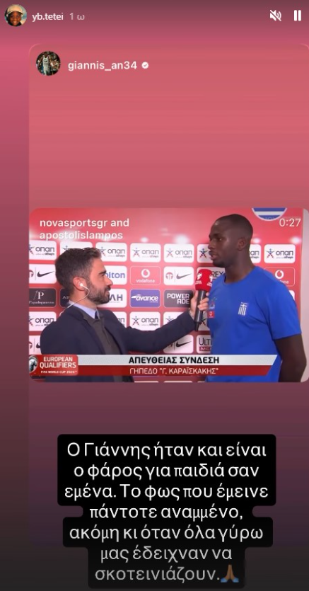 Ο Γιάννης Αντετοκούνμπο με αναρτήσεις του στα μέσα κοινωνικής δικτύωσης αναφέρθηκε με εγκωμιαστικά λόγια στο ντεμπούτο του 24χρονου φορ με την εθνική, αλλά και για το βραβείο «Player Activism».