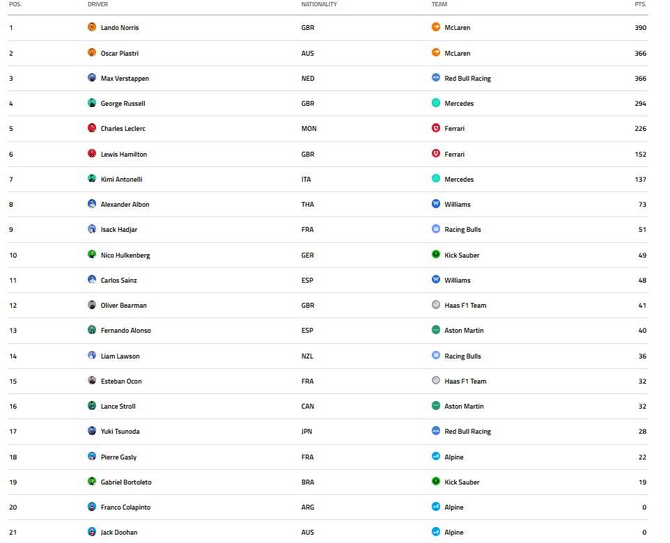 Η εξέλιξη αυτή ευνοεί τον τετράκις παγκόσμιο πρωταθλητή της Red Bull, Μαξ Φερστάπεν, καθώς ο Ολλανδός «έπιασε» τον Πιάστρι στην δεύτερη θέση της κατάταξης των οδηγών με 366 βαθμούς, ενώ ο Νόρις προηγείται με 390 βαθμούς. Υπενθυμίζεται ότι απομένουν ακόμη δύο αγώνες για την ολοκλήρωση της σεζόν και συγκεκριμένα τα γκραν πρι σε Κατάρ (30/11) και Άμπου Ντάμπι (7/12), με το πρώτο εξ αυτών να περιλαμβάνει και αγώνα σπριντ, ήτοι οκτώ επιπλέον βαθμούς προς διεκδίκηση.