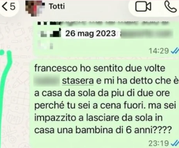 Όταν δεν κατάφερε να επικοινωνήσει με τον Τότι, του έστειλε στις 23:19 το μήνυμα που έγινε στη συνέχεια δημόσιο: «Φραντσέσκο, μίλησα με την κόρη μας δύο φορές απόψε και μου είπε ότι είναι μόνη στο σπίτι για πάνω από δύο ώρες επειδή έχεις βγει για δείπνο. Είσαι τρελός που αφήνεις ένα 6χρονο κορίτσι μόνο του στο σπίτι;».