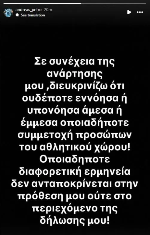 Λίγες ώρες αργότερα, ο Πετρόπουλος κατέβασε το αρχικό story και προχώρησε σε νέα ανάρτηση, ξεκαθαρίζοντας τη θέση του.