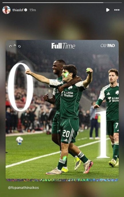Ο σέντερ της ομάδας μπάσκετ ανάρτησε στο Instagram story του την πανηγυρική φωτογραφία που δημοσίευσε η ΠΑΕ, δείχνοντας τους Βισέντε Ταμπόρδα και Ανδρέα Τεττέη να αγκαλιάζονται μετά το γκολ του Αργεντινού.