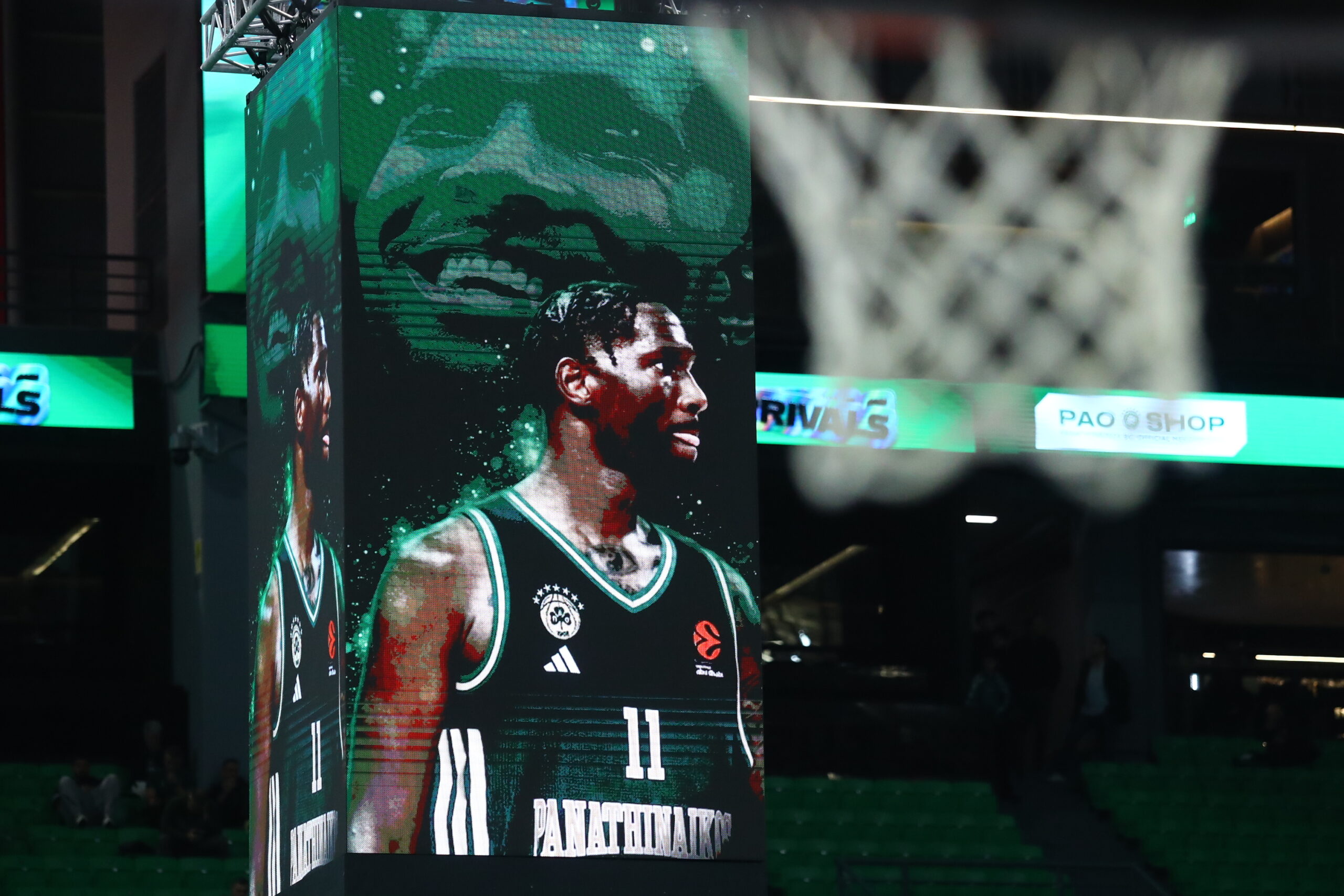 Ο Αμερικανός άσος δεν έχει ταξιδέψει ακόμη στην Ελλάδα, ωστόσο η παρουσία του έγινε αισθητή – έστω και συμβολικά – στο Telecom Center περίπου μία ώρα πριν από το τζάμπολ της αναμέτρησης με τη Fenerbahçe Beko, για την 28η αγωνιστική της EuroLeague.