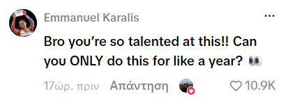 Η αντίδραση του Manolo δεν άργησε να έρθει. Σε ένα χιουμοριστικό σχόλιο κάτω από την ανάρτηση στο TikTok, ο Καραλής έγραψε: «Αδερφέ, είσαι τόσο ταλαντούχος σε αυτό! Μπορείς να κάνεις μόνο αυτό για έναν χρόνο;».