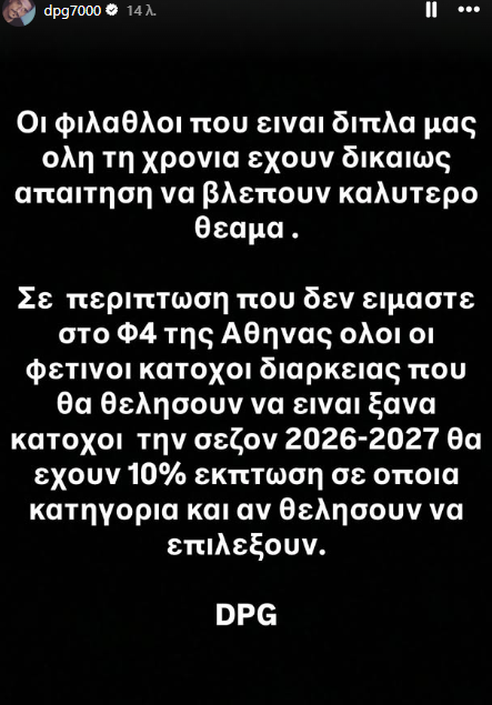 Με πρώτο story τόνισε πως θέλει από τους παίχτες του να κάνουν το 6/6 στα επόμενα ματς και με νέο story ο μεγαλομέτοχος της ΚΑΕ, ενημέρωσε πως αν η ομάδα δεν καταφέρει να περάσει στο Final-Four που θα γίνει στην Αθήνα, τότε οι κάτοχοι διαρκείας θα έχουν έκπτωση την επόμενη χρονιά 10% σε όποια κατηγορία και αν επιλέξουν.