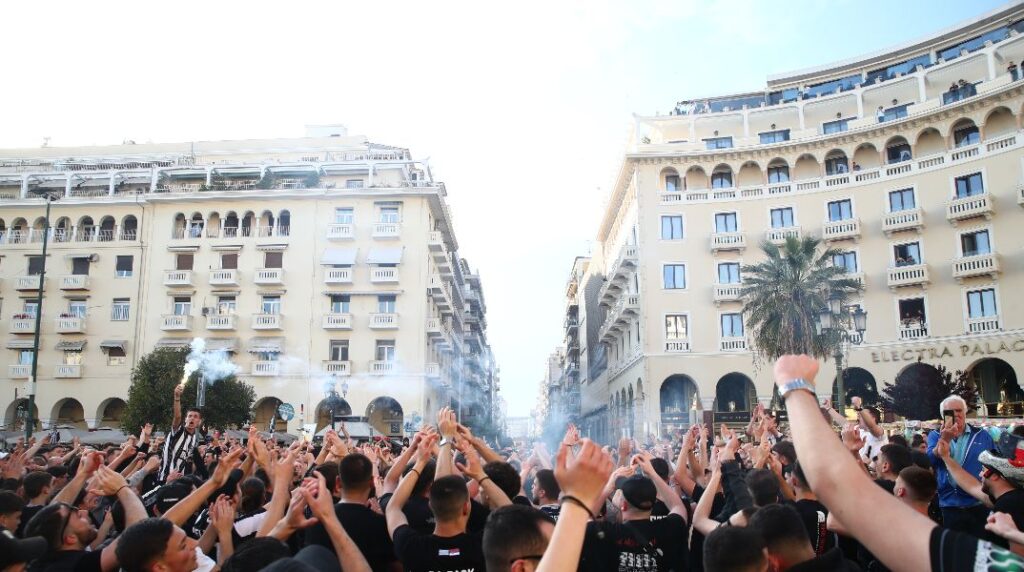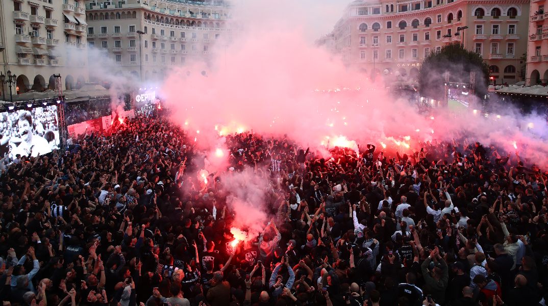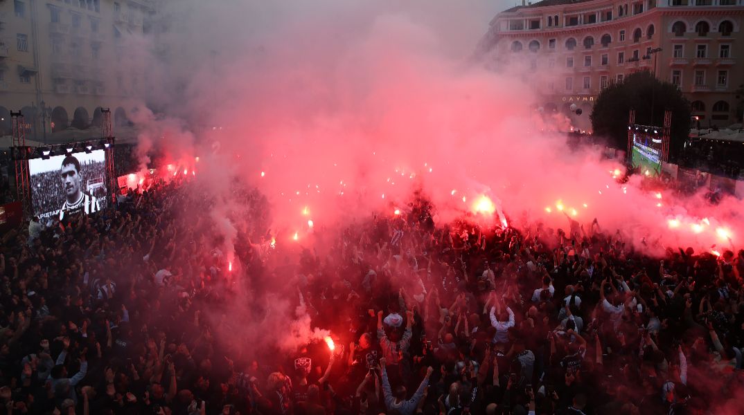Όταν το ρολόι έδειξε 19:26 (χρονολογία ίδρυσης), οι οπαδοί του ΠΑΟΚ έβαλαν… φωτιά στην πλατεία της Θεσσαλονίκης, με τα δεκάδες καπνογόνα και τα πυροτεχνήματα να δημιουργούν μαγική ατμόσφαιρα.